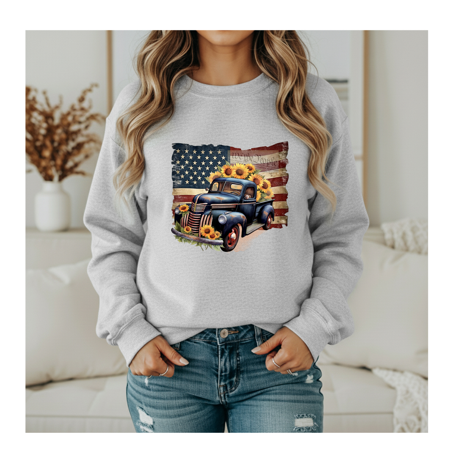 A cozy blend of patriotic charm and country style. This Patriotic Classic Truck Sunflowers Crewneck features a vintage truck design filled with sunflowers and patriotic details, printed on a soft, fleece-lined crewneck perfect for everyday wear. Made to order with care for comfort that lasts.